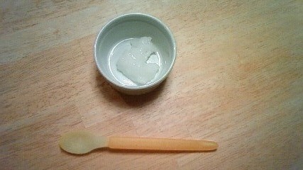 RINGが食べてた冬至かぼちゃのあんこをスプーンにとって与えてみたら美味しそうになめてた。いつもおかゆはあんまり食べたがらないのは味がないからかな?